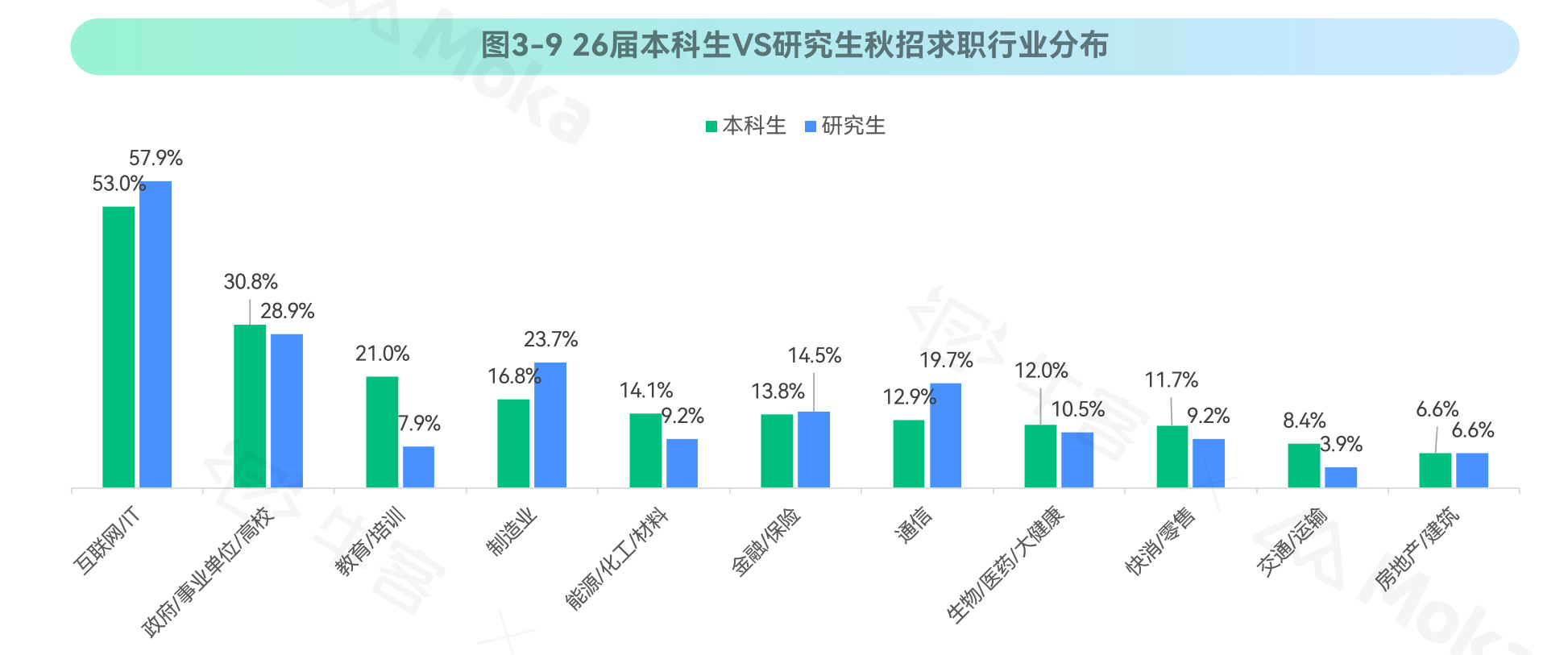 研究生投递更加集中互联网和制造业等专精行业,而本科生除互联网行业之外,三成学生更偏好体制内岗位。