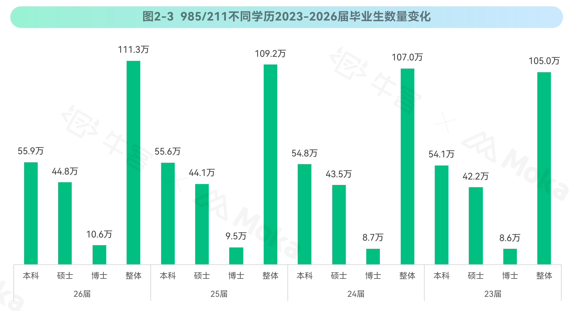 牛客×Moka出品的《2025秋季校园招聘白皮书》数据显示,全国985/211高校毕业生规模突破111.3万人,呈现出"本科为基、硕博扩张"的显著特征。面对高质生源结构的新变化与招聘效率的双重挑战,企业亟需构建智能化的人才筛选体系。本文基于《2025秋季校园招聘白皮书》核心数据,解析三大关键趋势。