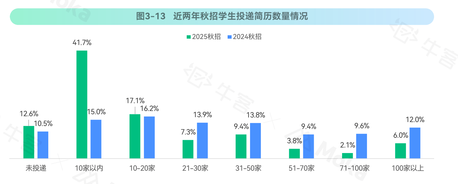 41.7%学生投递简历集中在10家以内,精准投递趋势显著。企业需通过AI面试工具快速筛选高匹配度候选人。
