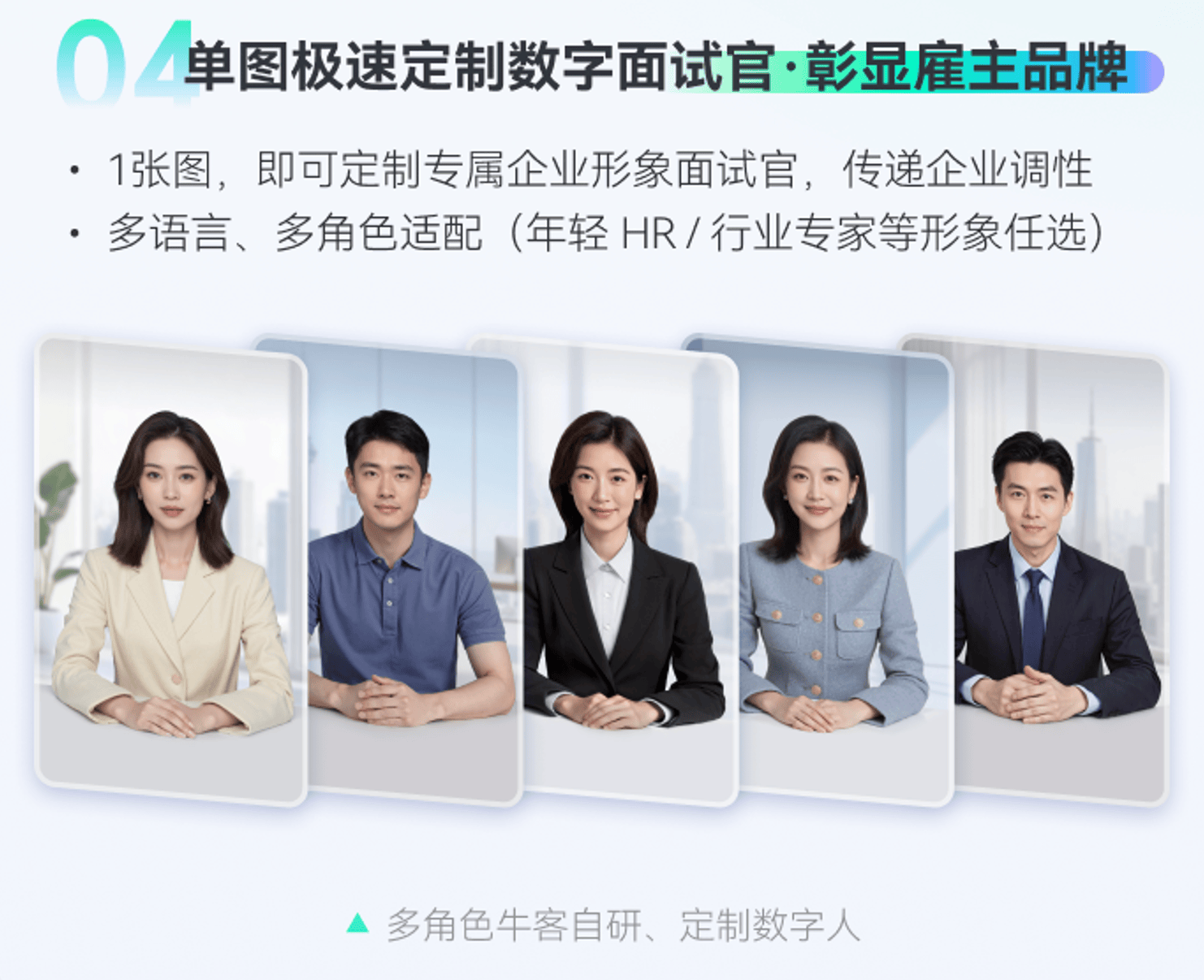 极速定制数字人服务:仅需上传企业LOGO或形象素材,即可生成专属品牌形象面试官,支持多语言切换与角色设定(如年轻HR/行业专家),强化雇主品牌感知。