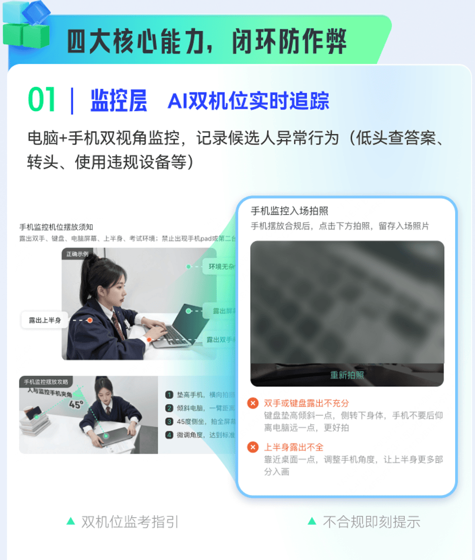 双机位实时监控:电脑主画面+手机副画面同步录制,实现360°行为追踪